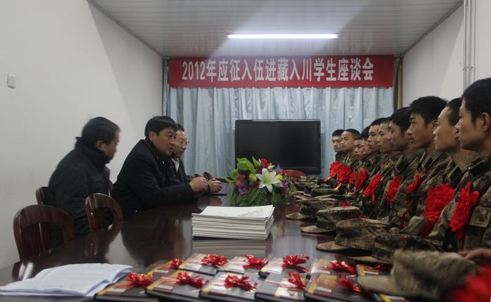 12月12日下午,我校在后备军官学院二楼会议室召开河南理工大学2012年进藏入川新兵座谈会,为我校入伍去西南边陲服役的同学送行。校党委武装部部长芦保宏主持会议。