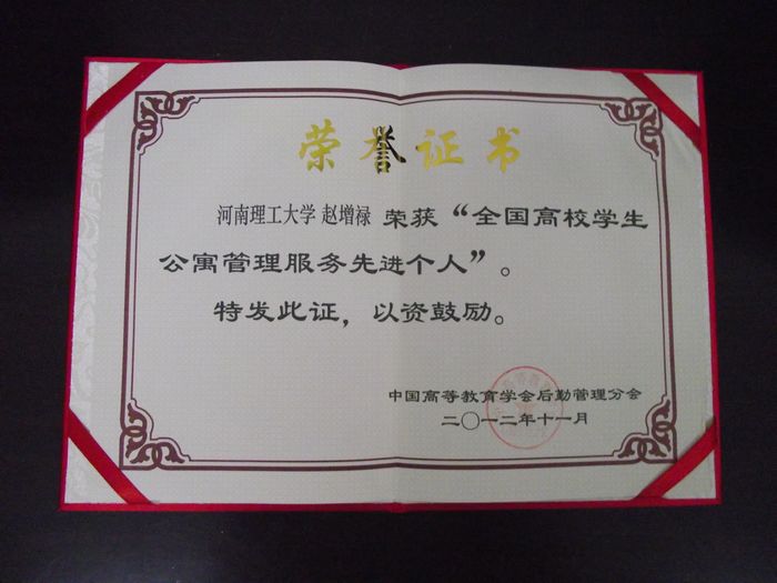 11月24日,中国高教会后勤管理分会学生公寓专业部2012年年会暨全国高校学生公寓工作先进单位及先进个人表彰大会在贵州省贵阳市举行,我校喜获“全国高校学生公寓管理服务工作先进单位”荣誉称号,赵增禄同志被授予“全国高校学生公寓管理服务先进个人”荣誉称号。