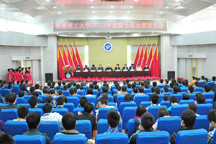 会议在庄严的国歌声中开幕。首先,研究生处处长赵同谦宣读了我校关于授予杨文朋、胡玉昆等12人一等奖及程东峰、武守辉等17人二等奖的“金属材料及加工工程学科发展基金”研究生奖学金表彰决定。随后,教务处处长宣读了授予史长亮、马倩等8人一等奖和裴卫兵、郭丽玲等23人二等奖的“矿物加工工程学科建设基金”研究生奖学金表彰决定。之后,科技处处长张国成宣读了授予米国发、郭学峰、李安铭等19人“金属材料及加工工程学科发展基金”优秀论著表彰的决定。随后,主席台上就坐领导为获奖代表颁奖。