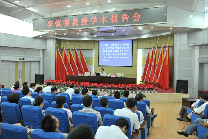 聘任仪式结束后,李慎明教授为我校师生作了题为《沿着中国特色社会主义道路奋勇前进——学习胡锦涛总书记2012年7月23日在省部级主要领导干部专题研讨班重要讲话的体会》的学术报告。报告分为四个部分:一是胡锦涛总书记“7?23”讲话的重大意义,二是讲话的基本精神,三是坚持中国特色社会主义道路的机遇与挑战,四是坚持中国特色社会主义道路,为全面建设小康社会而奋斗。李慎明教授认为,胡锦涛总书记“7?23”重要讲话科学地总结了过去十年的发展历程,深刻分析了当前的国际国内形势,对全面建设小康社会作了科学论述。以马列主义、毛泽东思想为指导的中国特色社会主义是中国特色社会主义道路、中国特色社会主义理论体系、中国特色社会主义制度的灵魂,要实现全面建设小康社会、实现社会主义现代化的宏伟目标,就必须毫不动摇地坚持中国特色社会主义。他详细分析了我国面临的来自国际和国内的机遇与挑战,认为我国仍然处于战略机遇期,和平、发展、合作仍是当今时代的潮流,世界多极化、经济全球化继续发展,科技革命迅猛发展,中国特色社会主义建设的巨大成功,都给我国带来了前所未有的发展机遇;同时,必须正视我国发展过程可能遇到的各种巨大风险,如西方势力西化、分化中国的图谋,加入世界贸易组织的影响,捍卫国家主权和领土完整问题,输入型恐怖主义势力,国内诸多方面存在的问题,都对未来的发展提出了严峻的挑战。最后,他勉励大家认真学习马克思主义理论,坚定正确的理想信念,坚持党的基本路线,坚持走中国特色社会主义道路,居安思危,埋头苦干,为实现中华民族伟大复兴做出贡献。报告持续3个小时,在师生中产生了强烈反响。