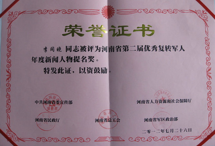 据悉,李同晓等一批优秀复转军人的简要事迹分别在《河南日报》、《大河报》、《东方今报》、大河网、河南国防教育网等媒体同步刊登。根据组委会规定,河南省总工会将按程序为年度十大新闻人物获得者申报省“五一劳动奖章”, 各地级市总工会将按程序为提名奖获得者申报地级“五一劳动奖章”。