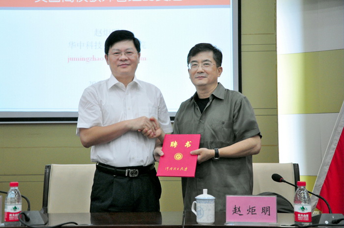 6月26日上午,赵炬明兼职教授聘任仪式在学校南校区力行楼学术报告厅举行。副校长卫中玲主持聘任仪式,校长邹友峰为赵炬明教授颁发了兼职教授聘书。聘任仪式结束后,全校处科级干部听取了华中科技大学教科院教授、博士生导师赵炬明教授题为《人力资源管理与美国高校教师管理的变迁》的学术报告。学术报告会由副校长卫中玲主持。
