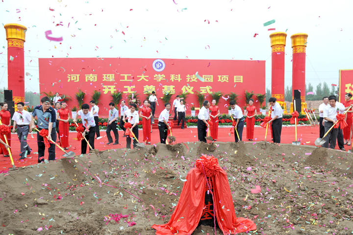 最后,焦作市副市长乔学达庄重宣布:“河南理工大学科技园建设项目开工”,参加奠基仪式的全体领导挥动铁锨,共同为河南理工大学科技园培土奠基。