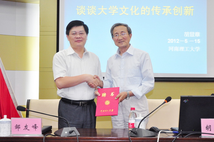 校长邹友峰为胡显章教授颁发聘书