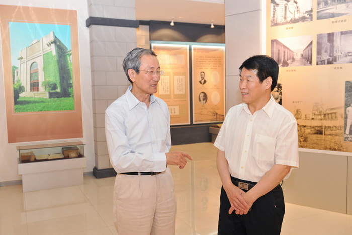 校党委书记王少安陪同胡显章教授参观校史馆
