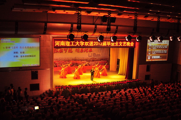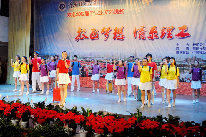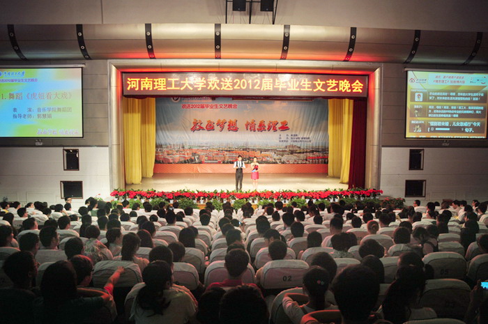 满园桃李花竞艳,依依又逢惜别时。6月19日晚,由我校校团委主办、音乐学院和体育学院协办的“放飞梦想 情系理工”欢送2012届毕业生文艺晚会于我校南校区小礼堂浓情上演。我校校长邹友峰,党委副书记周志远,副校长张战营及相关职能部门和各学院领导、老师以及广大毕业生千余人观看了演出。