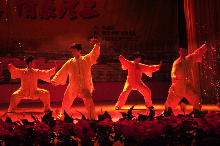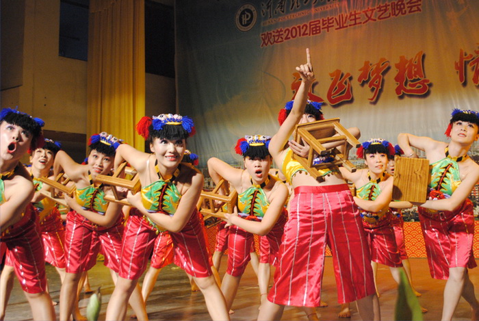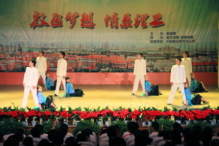 俏丽的衣着,夸张的表情,活泼热情而又憨态可掬的表演,欢天喜地的锣鼓声中,由音乐学院编排的舞蹈《虎妞看大戏》激情上演,在欢快热烈的氛围中为晚会拉开了序幕。明德任责展现理工风采,好学力行彰显理工精神,光阴似箭,日月如梭,回望大学四年,一首首动人的歌曲,便是一幅幅珍藏在记忆深处的画面:我们青春,我们《奔跑》;我们风华正茂,我们是《龙的传人》;说一声告别,《我睡在上铺的兄弟》;道一声珍重,《再见了我最爱的人》;下一站我们分别,青春,依旧在岁月里无限明媚,梦想,再次向着远方灿烂《启航》。桃花潭水踏歌意,筝弦琵琶阳关情,古典与现代的完美交织,歌声与舞蹈的激情对撞,热情与柔婉的巧妙融合,歌舞表演《老师,我总是想起你》、器乐演奏《奇迹》也同样为在场师生带来了一场场美妙的视听盛宴。“只要祖国一个召唤,就是我们理工人无上的光荣”,“祖国,我在这里”,“为了爱,留下”, 诗朗诵《青春的榜样》、音诗画表演《青春的使命》以其活泼的形式,深情的表演生动地诠释了我理工学子时刻准备着为祖国、为使命奉献青春、奉献自我的可贵精神,博得了场内的阵阵掌声,引发了无数师生的深切共鸣,将全场气氛一度推向高潮。随后,松柔慢匀领略文化风采,刚柔相济感悟斑斓人生,太极拳表演《行云流水》也同样赢得了在场师生的阵阵喝彩。多少不舍在心间,多少祝福诉不完,精彩的大学生活分享,精彩的短片回放,毕业生访谈《放飞梦想 情系理工》上,几位即将毕业的优秀学子结合自身毕业后或支教西部、或考研、或考取选调生的人生选择,阐述了他们对成功、对学习、对创业、对人生价值的看法以及对母校、对老师的不舍、感激与祝福。最后,他们还以自己的大学生活为例,鼓励学弟学妹们一定要刻苦努力,“时刻准备着迎接困难,努力地迎接成功”,令在场师生印象深刻。把酒言欢,昂扬青春锐气;载歌载舞,激情点亮梦想,最后,一首《二十年后再相会》将全场氛围再次推向高潮,并为晚会画上了一个圆满的句号。