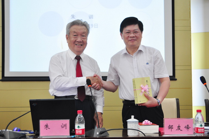 校长邹友峰在会上讲话,代表学校对朱训校长的到来表示衷心的感谢,对获奖师生表示热烈的祝贺。他指出,朱训先生自2006年出任学校名誉校长以来,一直十分关心和鼎力支持学校的建设与发展,并多次亲临学校指导工作,为学校百年校庆成功举行和省局共建顺利实现,倾注了大量心血。朱训校长虽年过八十,仍笔耕不辍,以认真、勤奋、严谨的精神为师生树立起榜样,为提高学校发展水平提供了强大精神动力。邹友峰希望广大教职员工按照胡锦涛总书记在纪念共青团成立90周年大会上的讲话要求,把力量汇聚到关注青年、关心青年、关爱青年上来,积极探索建立全员育人模式,鼓励引导学生尽快成长为可堪大用、能负重任的栋梁之才;希望广大同学牢记朱训校长殷切期望,坚持远大理想,坚持刻苦学习,坚持艰苦奋斗,坚持开拓创新,坚持高尚品行,不断提高自身的科学文化和思想道德素质,踊跃投身改革开放和社会主义现代化建设伟大实践,努力做科学发展的奋力推动者、和谐社会的积极构建者。