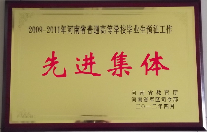 近日,河南省教育厅、河南省军区在郑州召开征兵工作总结表彰暨学校征兵工作会议,会议下发了《河南省教育厅 河南省军区司令部关于表彰全省普通高等学校毕业生入伍预征工作先进集体和先进个人的决定》(教学〔2012〕355号),我校荣获“2009-2011年河南省普通高等学校毕业生预征工作先进集体”荣誉称号。