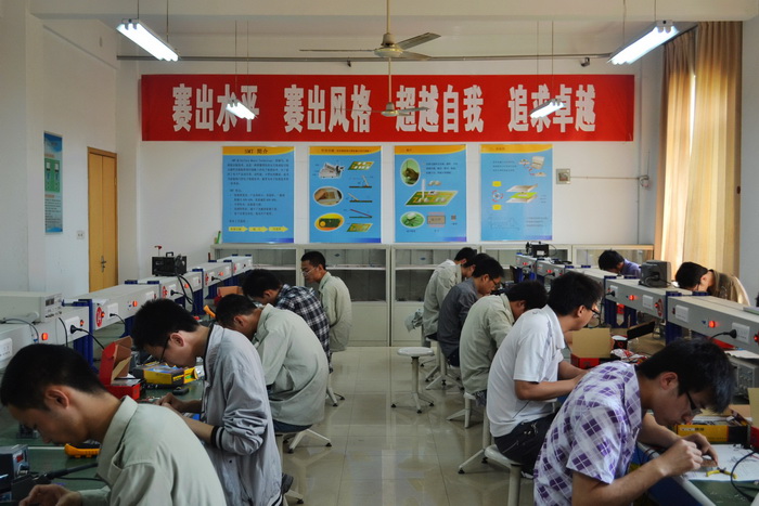 本届大赛报名选手共513人,经过一系列的角逐最终有257人成功晋级决赛。决赛项目由六部分组成,其中包括车削加工、数控技术、装配技术、焊接技术、铸造技术和电子产品组装。比赛开始前,选手们沉着冷静,有条不紊的准备赛前工作。随着一阵铃声响起,战斗的号角打响了。参赛选手全神贯注投入比赛当中,只见他们各个精神饱满、斗志昂扬,熟练地操作着各种设备仪器。车削加工是利用车床上工件的来改变毛坯的形状和尺寸,将其加工成符合图纸的要求。它要求参赛选手读清图纸,并对车床操作十分熟练;数控技术是通过数字控制的方法对某一工作过程实现自动控制,它要求选手的数控机操作技术十分娴熟;装配技术、焊接技术和电子产品组装讲究组装、连接、焊接的精密性;而铸造技术是将熔融的合金材料注入的铸型中经冷却后获得零件,它对于浇铸时间、材料性质的掌握等都有较高的要求。比赛现场的气氛热烈而紧张,没有摇旗呐喊,没有你争我夺,有的只是选手们专注的神情和脸颊上沁出的汗水。随着比赛的进行,一件件精心加工的产品出炉,选手们的脸上终于浮现出胜利的微笑。“我参加了电子产品组装的比赛,”走出赛场的小刘神色略显疲惫,“我们所做的就是按照复杂的图纸,把电子元件焊接在一起,虽然看起来像一团麻,但是真正做起来却是很有吸引力的。那复杂的图纸在我们眼里可是最美的图画啊!”从他远去的笑声中,我们听到的不是苦和累,而是自信和快乐。比赛结果将于近期公布。