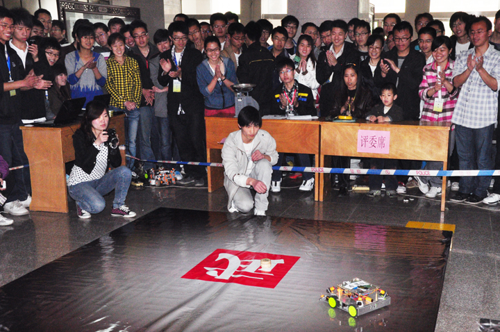 比赛伊始,工程训练中心副主任张英琦致词并宣告比赛开始。此次大赛共设机器人武术擂台赛标准组、仿人组、非标准组、机器人游中国、双足竞步机器人及舞蹈机器人等4个大类共6个项目,全校共有23支代表队参赛。在比赛现场设立了学生自制机器人展示区,投篮机器人、自主导航固定翼飞行器、六足抢险救灾智能机器人、智能灾害探险搜救机器人等学生自主研制的机器人颇受青睐。在武术擂台赛中,双方机器人在规定时间内将对方打下擂台,或者将干扰性棋子推到台下多者为胜。伴着时而舒缓,时而紧促的鼓点声,机器人时而僵持不动,时而厮杀激烈,稍不留神,就会被对手一举推到台下。现场观众不时地为这些“搏击者”的出色表现报以热烈的掌声和欢呼声。接着,在机器人游中国场地内,各式各样的机器人沿着指定路线,在有限的时间内寻找具有云台山、黄山等标识的国内景点,以游览数目多者为胜。接下来,进入自由体操机器人的风采展示环节,各种造型的机器人吸引了众多人的眼球,鞠躬、滚翻、倒立、劈叉、单手俯卧撑等一系列动作被机器人演绎的惟妙惟肖,观众将现场围得严严实实。经过紧张而激烈的角逐,“希翼队”、“飞梦队”和“前进队”分别荣获标准组、非标准组和仿人组第一名,“宇神队”、“鹏飞队”和“炫姿队”分别荣获机器人游中国、双足竞步机器人和舞蹈机器人第一名。至此,河南理工大学第二届机器人大赛圆满落幕。