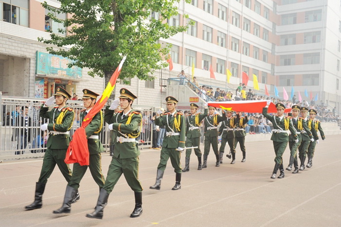 随后,在雄壮激昂的国歌中,举行升旗仪式。国旗在万名师生的注目下徐徐升起。