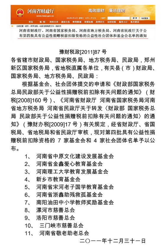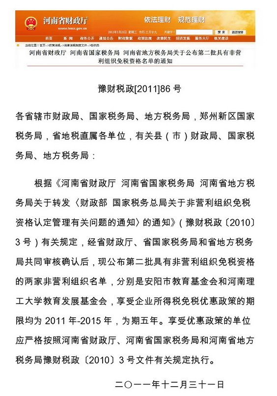 日前,河南省财政厅、河南省国家税务局、河南省地方税务局、河南省民政厅联合发文公布了获得“公益性捐赠税前扣除资格”和“非营利组织免税资格“名单,我校教育发展基金会喜获两项资格批准。