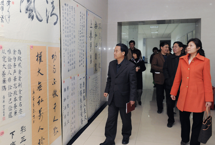 观看教职工反腐倡廉书法作品展