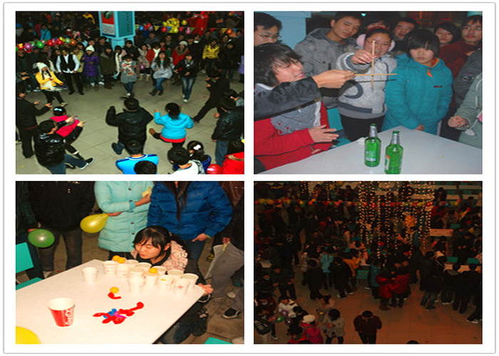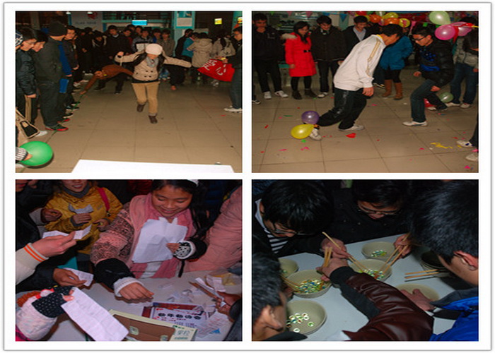 彩灯竞闪绚烂夜空,笑声飞扬飘洒校园。游园现场,人头攒动,热闹非凡,处处洋溢着节日的欢乐和喜庆氛围,一阵阵欢呼声、喝彩声此起彼伏,冲破寒夜,飘荡在乐园上空。其中,“一反常态”、“三人抱成团”等游戏新颖别致,以妙趣横生的形式锻炼着大家的反应能力。一个小小的乒乓球玩法也不断被创新,“掌上明珠”、“乒乓投篮”、“运送乒乓球”等各种小游戏让乒乓球大展风采,为活动增加了无限乐趣。“弹玻璃球”、“泡泡糖”、“抢凳子”、“摆硬币”,这些多数人童年玩过的游戏,更是给活动增添了童年趣味,让人回味无穷。更有“指手画脚”、“上下中矢”、“金鸡独立”等游戏不断地考验着参与者的耐心和协调性,使大家在娱乐之余也得到了锻炼。如“步步惊心”、“给你‘吸’望”、“穿越‘火’线”等,彰显着同学们勇往直前的风采,吸引了大批同学参与围观。参与活动的同学紧张地迎接着挑战,旁观的同学在加油之余也都摩拳擦掌,跃跃欲试。绕口令,猜单词,“一心两用”,脑筋急转弯,对大家的智力与耐心进行着双重考验。另外,体育运动也别样刺激,吸引了大批体育爱好者的参与。
