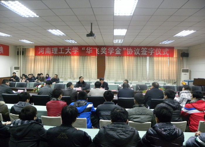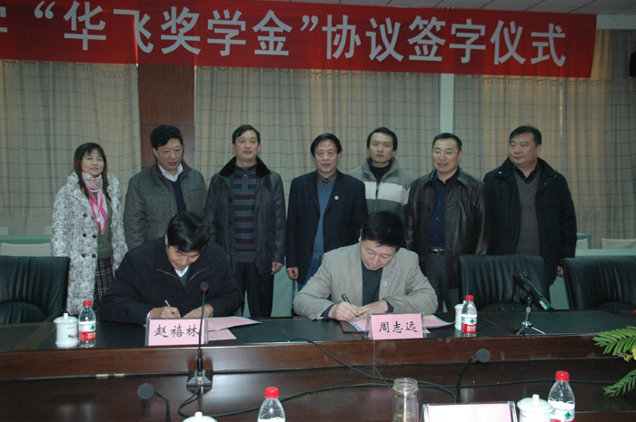 为支持教育事业,鼓励大学生成才,12月31日下午3点,我校“华飞奖学金”协议签字仪式在电气楼一楼会议室举行。华飞公司董事长赵禧林,华飞总工程师张富贵,人力资源部部长张海群,我校党委副书记周志远,学生处处长邵强,电气工程与自动化学院党委书记康全玉、院长余发山、党委副书记王少华,副院长郑征出席了会议。会议由该院党委书记康全玉主持。