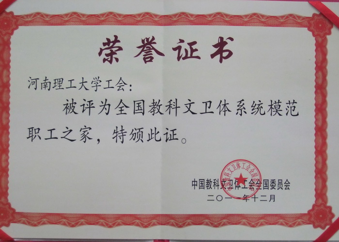 近日,中国教科文卫体工会全国委员会印发《关于表彰全国科教文卫体系统模范职工之家、先进工会组织、优秀工会工作者、模范职工之友的决定》(教科文卫体工〔2011〕28号),授予我校工会 “模范职工之家”荣誉称号。这是我校工会继去年被河南省总工会授予“模范职工之家”后获得的最高荣誉。