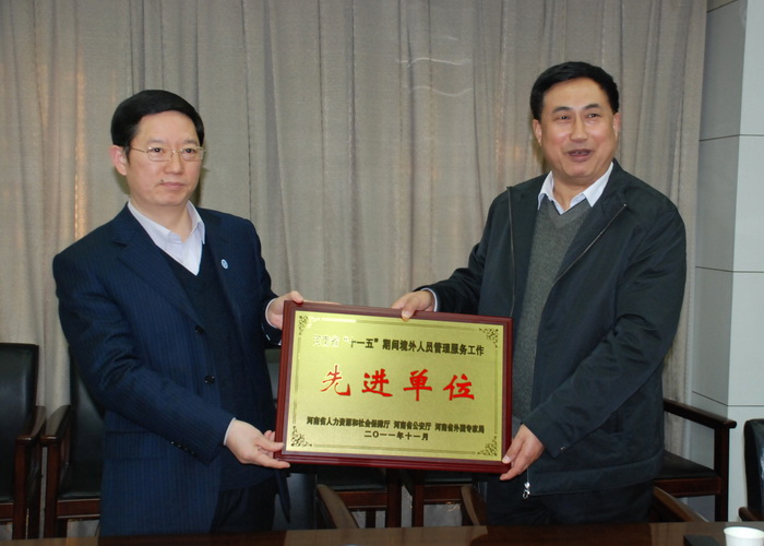 11月18日,省人社厅、省公安厅、省外专局在郑州联合召开“十一五”期间境外人员管理服务工作表彰大会,我校作为66个境外人员管理服务工作先进单位之一受到表彰。省政府刘世伟副秘书长受秦玉海副省长委托出席会议并讲话,省外专局局长郭成全宣读了表彰决定。12月16日下午,焦作市公安局副局长宋新明带领市出入境负责人亲自到校祝贺并将先进单位奖匾交给副校长景国勋手中。