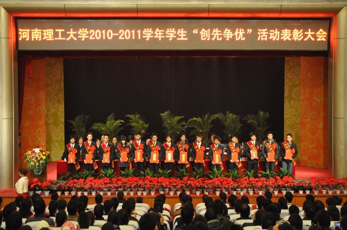 下午4点半,大会伴随雄壮的国歌正式拉开帷幕。会上,校党委副书记兼纪委书记张国臣宣读了获得2011年度河南省三好学生、省优秀学生干部、省先进班集体表彰的决定以及2011年度国家奖学金、国家励志奖学金学生名单。副校长周英宣读了河南理工大学关于表彰2010-2011学年学生“创先争优”活动先进集体和先进个人的决定。副校长张战营宣读了2010-2011学年河南理工大学关于“孙越崎优秀学生奖学金”、“九鼎科技奖学金”、“后勤大爱奖学金”、“采矿工程英才奖学金”的表彰决定。随后,在欢快激昂的乐曲声中,与会校党政领导和校友代表为获奖单位和个人代表颁发了证书。先进个人和先进集体代表分别作典型发言并进行了经验交流。