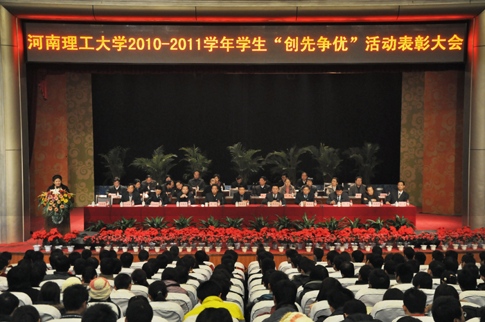 12月6日下午,我校2010-2011学年学生“创先争优”活动表彰大会在南校区小礼堂隆重召开。82级校友代表、河南理工大学九鼎科技奖学金创始人马桂霞,85级校友代表、采矿工程英才奖学金捐资人代表郭勇受邀莅临我校,我校党政领导张国臣、周志远、周英、张战营、王裕清、张锟、景国勋、杨建堂、丁安民,各学院、相关职能部门负责人及个人、集体获奖代表参加了大会。表彰大会由副校长景国勋主持。