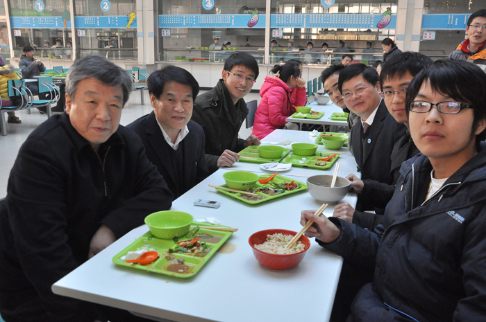 座谈会结束后,卢展工信步来到学苑餐厅与我校学生共进午餐。当同学们认出卢书记在餐厅窗口打饭并在一排餐桌坐下时,纷纷围拢过来,可以看出他们的激动和兴奋。卢书记边吃边与同学们亲切交谈,饭菜价格、家庭情况、专业年级、学习生活、就业选择、发展目标等等,饱含了卢书记对理工学子的深情关怀。当有同学请卢书记题词时,他当即寄语同学们要“根在河南、志在中华、为在中原、路在脚下”,并叮嘱理工学子要靠自己、自立自强。当卢书记起身准备与同学们分别时,有同学提出想合影留念,他欣然答应并微笑着与大家合影。随后,卢展工书记与在场师生一一亲切握手,同学们沉浸在幸福的甜美和依依不舍之中向卢书记挥手告别。