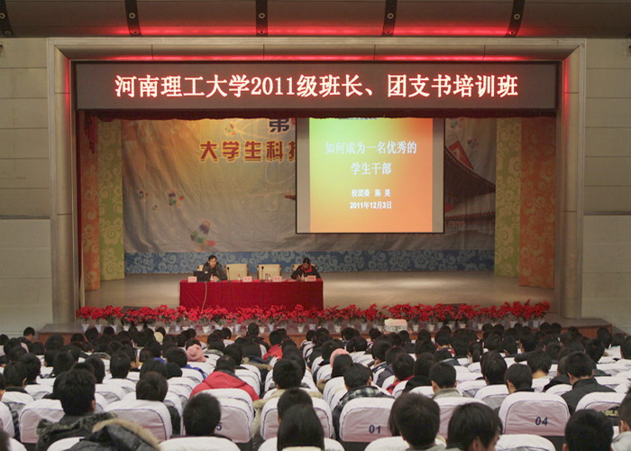 12月3日下午,由学生工作部(处)、校团委联合举办的“河南理工大学2011级班长、团支书培训班”在小礼堂顺利开班。学生工作部(处)部(处)长邵强、副部(处)长许荣梅参加了开班仪式。全校2011级班长、团支书,学校和各学院学生会骨干以及各学院带队老师共800余人参加本次培训班。培训班由许荣梅主持。