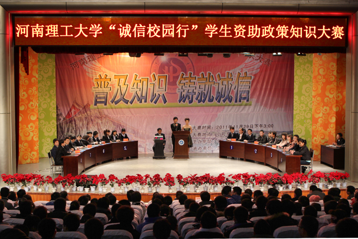 11月29日下午,由学生工作部(处)主办、校团委协办、能源学院承办的“诚信校园行”学生资助政策及相关知识大赛复赛在小礼堂举行。省学生资助中心孙惠萍老师、我校学生工作部(处)部(处)长邵强应邀观摩竞赛。河南工程学院资助中心主任吴晓萍、焦作大学学生处副处长杨红、焦作师专学生处副处长闫金龙,以及我校学生工作部(处)副部(处)长许荣梅、校团委副书记冯平应邀担任大赛仲裁委员会成员。各学院党委副书记、学工办主任、辅导员以及全校近千名学生一起观看了比赛。