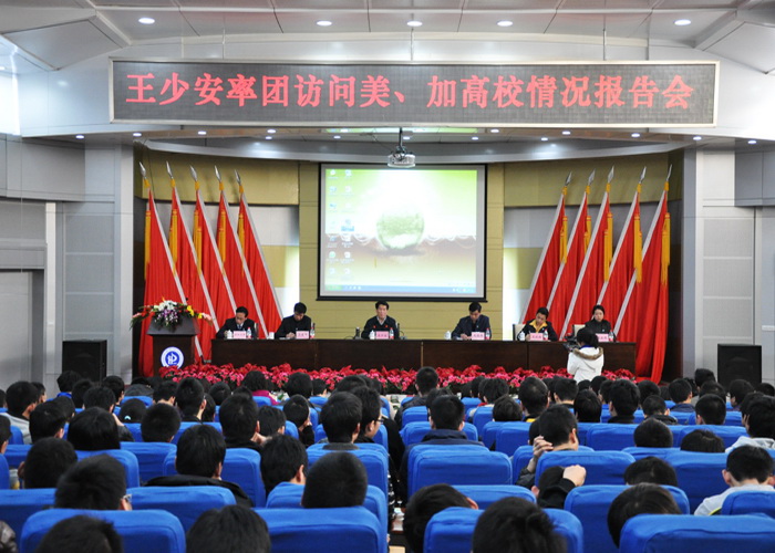 报告会上,校党委书记王少安首先介绍了访问美国北卡罗来纳农工州立大学和加拿大罗伊利斯特学院的背景,他指出,近两年,我校与国外高水平大学合作办学项目获得国家教育部批准,成功实现与美国、加拿大两所大学的合作办学,这对深入实施“开放发展”战略具有重要意义。这次访问,通过双方友好协商,在合作办学的指导思想、合作模式及人才培养模式、教师互访、互派交换生等方面达成了广泛共识,访问达到了预期的目的。之后,王少安从对当前美国政治、经济、社会特别是教育发展状况的认识入手,强调学校将坚定不移地实施“开放发展”战略,深化与国外高水平大学办学合作,充分利用国外优质教育资源,学习借鉴先进办学理念和教育经验,努力培养具有国际视野、了解国际规则、能够参与国际竞争的国际化人才。最后,王少安寄语全校学生,要结合自身实际,立下人生志向,做好人生规划,刻苦勤奋学习,增强外语能力,努力争取进入世界一流学府接受优质高等教育,成就自己美好人生,服务报效国家发展。报告会上,王少安还回答了同学们关心的出国留学途径、学费等热点问题。访问团成员王晓梅、欧阳文峰、李建中、李新娟分别介绍了对美国、加拿大高校访问的见闻、感想与给同学们的建议。