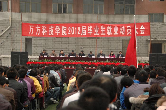 11月15日上午,万方学院2012届毕业生就业动员大会在北校区南操场隆重召开。副校长、万方学院院长王裕清,万方学院党政领导王建中、郑伦仁、杨玉海、茅艳以及各系(部)、相关职能部门负责人出席动员会。毕业班辅导员和2012届全体毕业生参加了动员会。大会对2012届毕业生就业工作进行了安排部署,动员全体毕业生认清形势、准确定位,积极准备,早日就业。大会由万方学院党委书记王建中主持。
