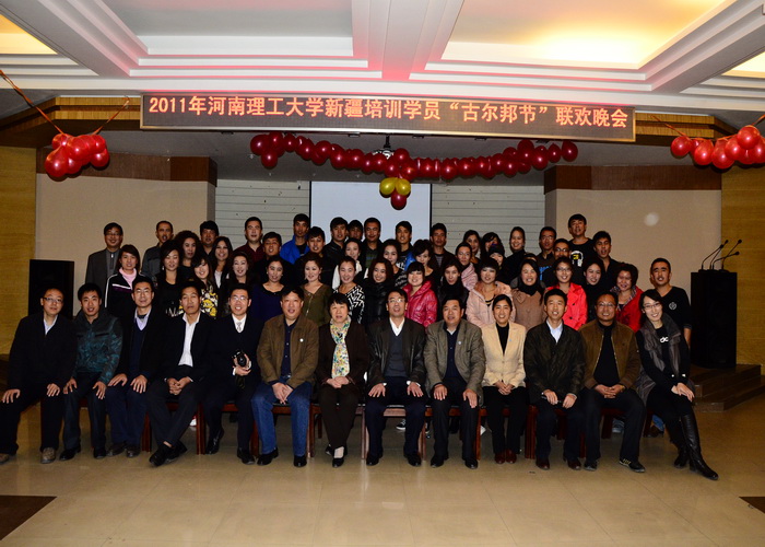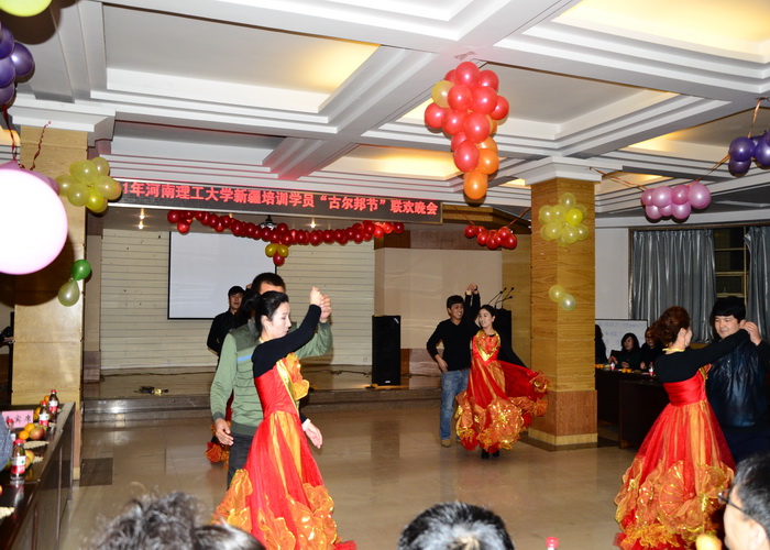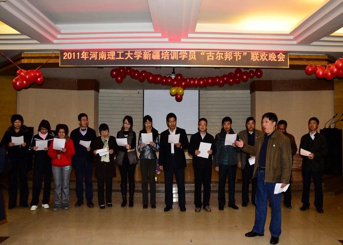 11月6日晚,我校新疆哈密培训班学员在就业招聘大厅举办了“古尔邦节”联欢晚会。联欢会在热情奔放的舞蹈麦西来甫《节日之欢》中拉开序幕。《我的姑娘在哪里》曲调轻快,诉说着新疆人民对爱情的崇拜和特有的表达方式;民间舞曲《纳兹尔库姆》浓郁的地域、民族特色,奔放的舞姿,明快的步伐,淋漓尽致地展现了现代新疆人火热的性格和多彩的生活,展现了新疆跨越发展、长治久安的崭新局面;学生工作部(处)部(处)长邵强带领在场的所有老师演唱的《河南理工大学校歌》铿锵有力,掀起了整场晚会的高潮。晚会最后以情景剧《感恩的心》落下帷幕,新疆学员以《感恩的心》来表达他们对党和国家给予他们这种机会的感恩,对长期帮助、关心他们生活、学习的老师表示感谢。