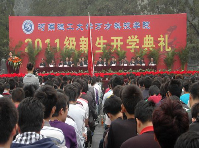 9月15日上午,万方学院焦作校区2011级新生开学典礼在篮球场隆重举行。校长邹友峰,校党委副书记周志远,副校长、万方科技学院院长王裕清,万方科技学院党委书记王建中、常务副院长郑伦仁、院党委副书记杨玉海、院长助理兼教务处处长茅艳与各系(部)、职能部门负责人出席了开学典礼。2011级新生与全体教职工参加了开学典礼。开学典礼由万方学院党委书记王建中主持。