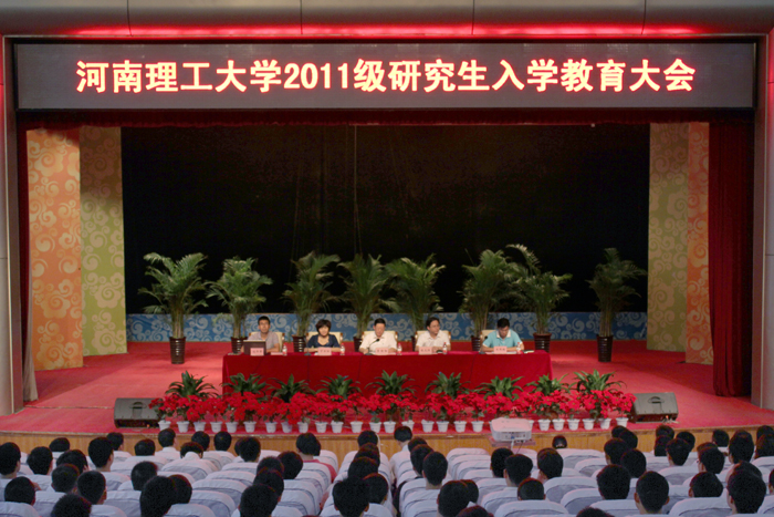 会议在庄重的校歌声中拉开帷幕。会上,副校长景国勋发表讲话,他为新生介绍了学校包括发展历史、师资队伍、教学、科研、学科与平台建设、人才培养等方面的基本情况,并分析了2011年全国、河南省及我校的研究生招生情况。会上,景国勋强调,我校高度重视研究生教育,坚持“强力发展研究生教育”方针,研究生规模从5年前的700余人发展到2000多人。博、硕士研究生培养工作定位清晰,目标明确,重点突出,措施有力。学校先后建立了研究生生源基地、产学研联合培养基地,相继出台了研究生创新计划、优博培育基金、研究生教育改革基金以及精品课程建设等文件,开展博士论坛、研究生学术论坛、研究生学术之星评选等活动并取得良好效果。学校研究生教育坚持基础理论与科研实践并重,理论研究与应用研究并重;强化研究生教育教学过程管理,切实提高培养质量;实施研究生教育创新工程,着力提高研究生创新能力,研究生教育事业取得了快速的发展。