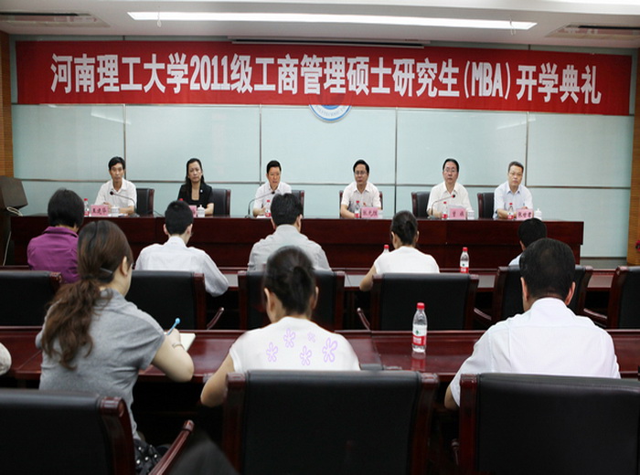 雨湿桂花香满地,世纪学府纳贤才。9月4日上午,河南理工大学2011级工商管理硕士研究生(MBA)开学典礼在二号综合楼报告厅隆重举行。副校长景国勋出席开学典礼,研究生处副处长张光胜、经济管理学院党委书记王晓梅、院长曾旗、党委副书记张世君和全体MBA学员及部分研究生参加了开学典礼。典礼仪式由经济管理学院副院长王建华主持。