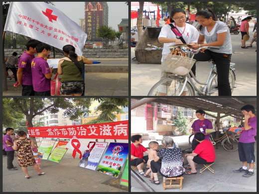 公益活动现场,一排制作精美的展板横放在“红丝带—焦作市防治艾滋病宣传调研”的大条幅下面,引来市民驻足观看,队员们热心在一旁讲解艾滋病的相关预防知识。队员们精心准备的“抱一抱,反歧视”活动吸引了广大市民注意。鉴于认识不足,市民一开始并不愿意接纳“艾滋病人”,经过志愿者细心地讲解之后,大家消除了歧视观念,纷纷献出爱心,亲切的和志愿者们拥抱。“爱你的人就叫红丝带,不仅是对艾滋病人的关心支持,更重要的是向广大市民义务宣传艾滋病知识,填补市民的知识空白,消除歧视,消除恐惧。”红丝带团队队员们向市民阐述着活动的主旨。同时,活动现场的另一边,“红丝带”志愿者正深入社区,冒着酷暑在人行道上发放宣传资料、红丝带,诚恳的邀请市民参与问卷调查工作。虽然炎炎夏日的骄阳炙烤着志愿者,可却没有影响“红丝带”志愿者们播撒爱心的热情。