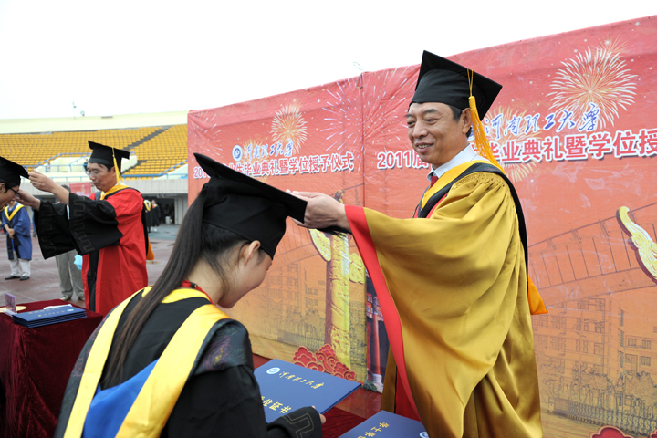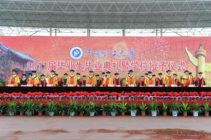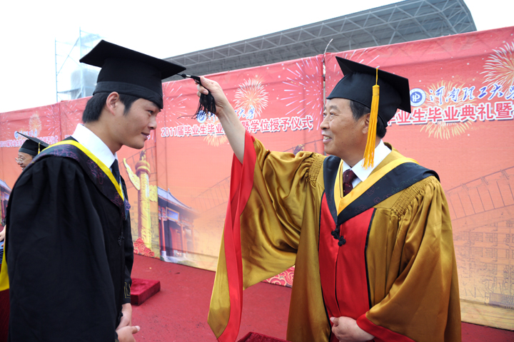 毕业典礼暨学位授予仪式在庄严国歌声中正式开始。首先,副校长张战营教授宣读了学校关于授予2011届毕业生毕业证书的决定;副校长王裕清教授宣读了学校关于授予2011届毕业生硕士、学士学位证书的决定;副校长张锟教授宣读了省教育厅和学校关于表彰2011届优秀毕业生的决定。接着,在主席台前排就坐的校领导为2011届省级、校级优秀毕业生代表和获得2011年龙软科技奖学金的毕业生颁发了荣誉证书,同时为博士、硕士、本科、专科及紧缺人才班毕业生代表颁发了毕业证书。随后,毕业生代表、材料学院学生杨成龙同学,教师代表、机械学院教师莫亚林教授,家长代表乔玉珍同志先后发言,分别表达了对母校的感激之情和对2011届毕业生的美好祝愿。