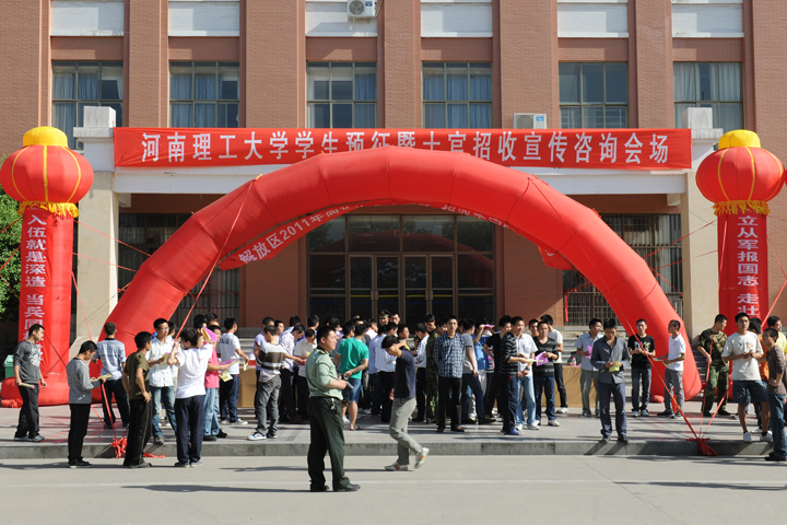 读文学理为成才,尚武从军固国防。5月13日上午,河南理工大学2011年预征暨士官招收宣传咨询会在明德广场成功召开。焦作市人民政府副市长赵建军、焦作市分区政委王继元、焦作军分区参谋长董建亚,我校党委副书记兼纪委书记张国臣亲临咨询会现场,相关职能负责同志陪同参加。