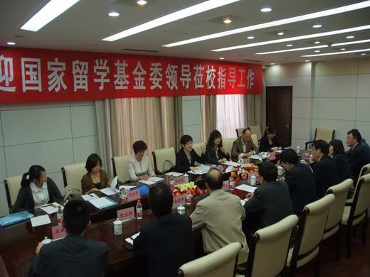 校长邹友峰代表学校对杨新育一行表示热烈欢迎。邹友峰首先简要回顾了学校百年来的办学历史和发展脉络,之后介绍了学校的办学规模、办学特色、科学研究、教育教学、人才培养、国际交流等基本情况及近几年取得的成绩,最后对国家留学基金委长期以来给予我校的关心和支持表示了衷心感谢,并表达了希望国家留学基金委对我校这所具有百年历史的地方特色高校加大支持力度的愿望。接着,留学基金委领导观看了我校宣传片,罗绍河对我校国际合作与交流情况做了详细汇报。杨新育在听取汇报之后,发表了热情洋溢的讲话,对我校的热情接待表示感谢;对我校在“人才培养”、“科学研究”和“服务社会”三个方面所取得的成就给予充分肯定;对留学基金委的工作职能、设置背景和“十二五”期间的工作设想做了简要介绍,并表示将给予学校尽可能的支持和帮助。