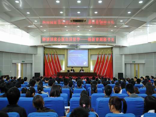 欢迎仪式后,杨新育在圆形报告厅为我校师生作了题为“解读国家公派出国留学政策”的报告。杨新育从国家留学基金管理委员会概况、国家公派出国留学政策、国家公派出国留学项目三个方面向我校师生做了详细讲解,并耐心细致地回答了在场师生的提问。杨新育语言生动形象,全面地介绍了国家公派出国留学政策、项目类别、申请方法等情况,使我校师生对国家公派出国留学政策有了深入的理解,极大地激发了我校师生的出国学习热情。