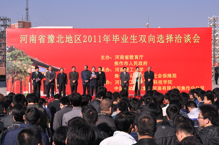 为贯彻落实全国、全省就业工作座谈会精神,扎实做好高校毕业生就业工作,努力搭建就业平台,促进高校毕业生顺利实现就业。3月26日上午,由河南省教育厅、焦作市人民政府主办,河南理工大学、焦作市人力资源和社会保障局承办的豫北地区2011年毕业生就业双向选择洽谈会在我校隆重开幕。