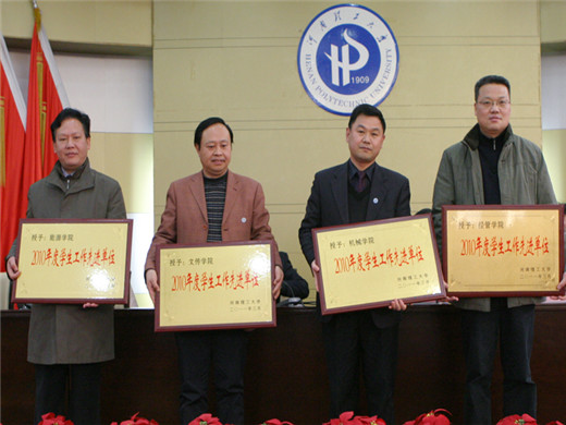 大会在雄浑嘹亮的国歌声中拉开帷幕。首先,景国勋宣读了《2010年度学生工作先进单位名单》,接着与会校领导为机械学院、文传学院、能源学院和经管学院颁发了“2010年度学生工作先进单位”奖牌。学生工作部(处)部(处)长邵强和就业指导中心副主任桑俊勇分别总结回顾了我校2010年学生工作和就业工作,并分别就2011年学生工作和就业工作进行安排部署。
