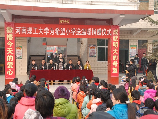 1月21日,我校在焦作市中站区店后希望小学举行了“送温暖、献爱心”捐赠活动。校团委代表学校广大团员青年为该希望小学送去了价值5万余元的羽绒服、棉门帘等物品,让农民工子女和困难小学生过一个温暖冬天。