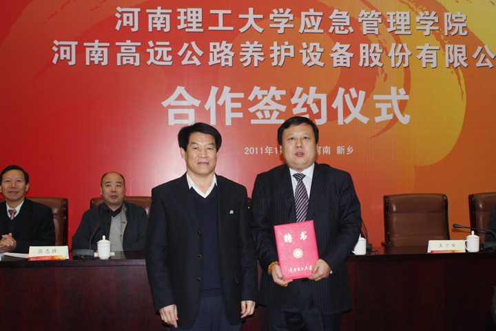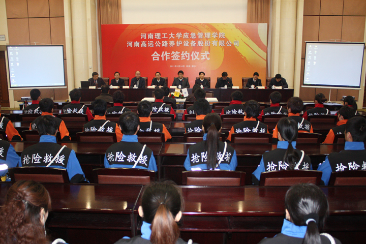 仪式上,河南省应急办主任余兴台向河南理工大学应急救援队和河南高远公司应急救援队授旗,校党委书记王少安为河南高远公司总经理陈琦颁发河南理工大学兼职教授聘书,副校长景国勋为河南高远公司颁发了“河南省应急管理技术研究中心产业化基地”、“河南理工大学应急管理学院‘产学研’基地”等牌匾和实习指导教师聘书,应急管理学院执行院长夏保成与河南高远路业集团董事长刘廷国签署合作协议。