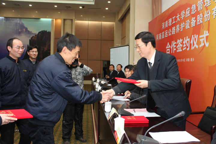 1月14日,我校与河南高远公路养护设备股份有限公司“产学研”合作关系框架协议签字仪式在新乡市人民政府会议室举行。河南省应急办主任余兴台,新乡市政府副秘书长张文慧、唐俊生,新乡市应急办主任张志强,校党委书记王少安、副校长景国勋,河南高远路业集团董事长刘廷国出席签字仪式,应急管理学院有关领导,河南高远应急抢险队和我校应急救援队等100余人参加仪式。仪式由河南高远公司总经理陈琦主持。