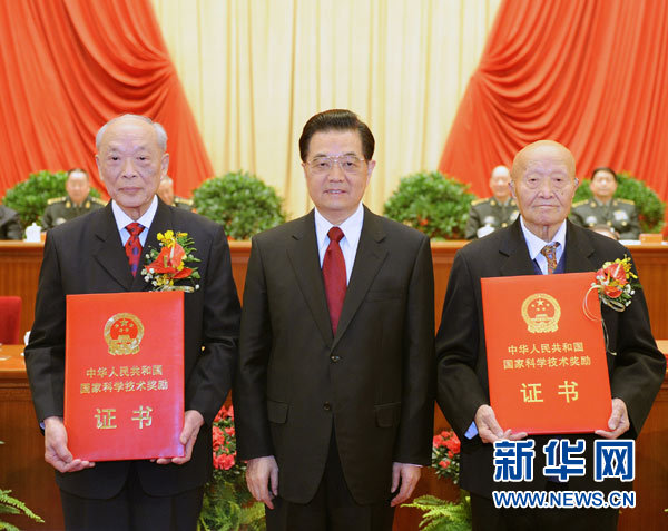 中共中央总书记、国家主席、中央军委主席胡锦涛向师昌绪院士(右)颁奖