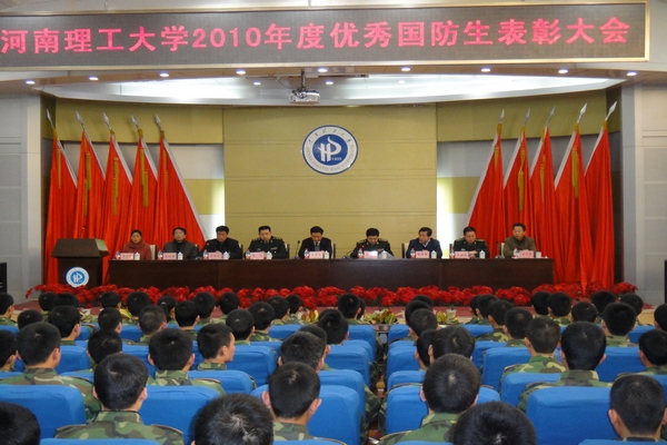 大会在庄严的国歌声中拉开帷幕。大会伊始,济南军区驻校选培办副主任吴海波宣读了《济南军区政治部干部表彰2010年度优秀国防生的通知》,后备军官学院党委副书记王立东宣读了《河南理工大学关于表彰2010年度优秀国防生的决定》。接着,主席台就座的领导为受表彰优秀国防生颁发荣誉证书。后备军官学院模拟营营长李全喜代表全体国防生发言。