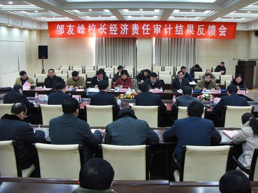 1月7日上午,校长邹友峰经济责任审计结果反馈会在南校区方形会议室召开。审计组组长、河南省审计厅党组成员、副厅长赵国新,审计组副组长、审计厅行政事业二处处长李少宏,副处长何敬伟、赖谦凡,主任张世锋、丁利国,焦作市审计局局长闫万国、副局长尹柯玲、科长焦崇奎和学校在校的党政领导王少安、邹友峰、张国臣、张战营、王裕清、张锟出席会议。党办、校办、纪委、审计、后勤集团、校办产业等部门负责人,财务处科级以上干部列席会议。会议由校党委副书记兼纪委书记张国臣主持。