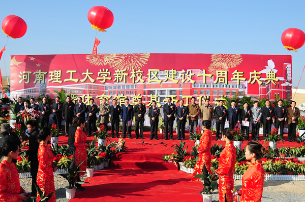 仪式在激昂的乐曲和雄壮的礼炮声中开幕。首先,校长邹友峰致词。他代表河南理工大学全体师生,向光临此次庆典的各级领导和各界朋友表示热烈的欢迎和衷心的感谢,并回顾了河南理工大学新校区建设走过的十年风雨历程。他指出,学校新校区始建于2000年,面对党和国家加快高等教育发展的国策,扩大高等教育规模、加快高等教育大众化进程的机遇,在省教委、省政府、省发改委、省教育厅的正确领导和焦作市委、市政府、焦作高新区、农业银行焦作分行的大力支持下,学校审时度势,抢抓机遇,果断决策自筹资金建设新校区。自2000以来,学校先后获得博士学位授予权、更名为河南理工大学、本科教学水平评估优秀、国家实验室培育基地和17个省部级创新平台与团队、27个国家及本科教学质量工程建设项目等一系列重大突破。邹友峰指出,体育馆是我校单体投资规模最大的一个建设项目。我们将以新校区建设十周年为契机,沿着学校第一次党代会确定的发展方向和目标,解放思想,抢抓机遇,奋力加快以质量、内涵、特色协调发展为根本要求的高水平教学研究型大学进程,为实现中原经济区战略构想和河南振兴,做出更大的贡献。