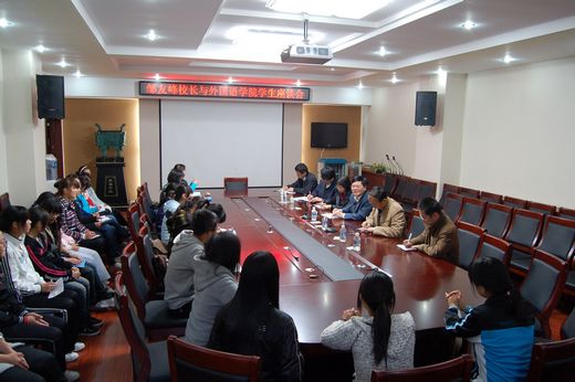 11月10日下午,校长邹友峰与外国语学院2010级英语专业3班全体同学在该院会议室亲切座谈。校长办公室、外国语学院等部门负责同志陪同座谈。座谈会由外国语学院院长赵增虎主持。