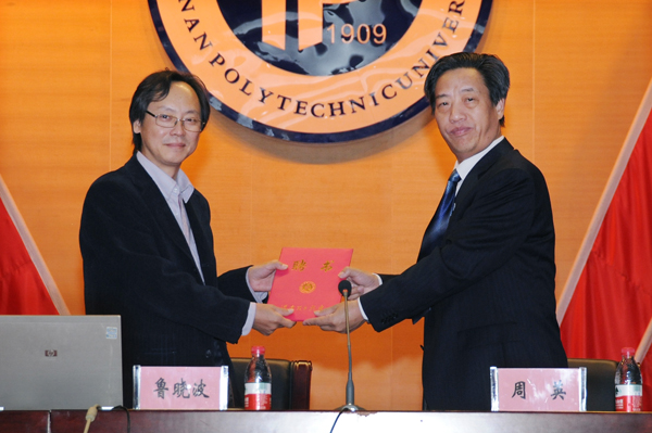 副校长周英为鲁晓波教授颁发河南理工大学兼职教授聘书