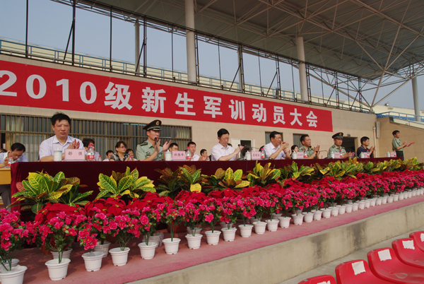 9月13日上午,我校2010级新生军训动员大会在新体育场隆重举行。校党委副书记兼纪委书记张国臣、副校长景国勋出席会议,中国人民解放军71426部队政治部副主任喻新军中校、军训团团长王海涛少校、军训团政委杜胜峰上尉及学校军训工作领导小组成员参加大会。大会由后备军官学院院长、武装部部长芦保宏主持。